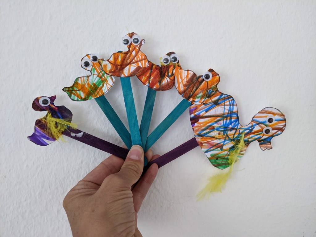 My favourite way to use this song and story is to print out a duck template with the mother duck and five ducklings and to let the children color them in and cut them out (if they are old enough). Gluing on feathers is also fun if you have some. Once they are finished, attach them to six individual sticks and you’re ready to go!
