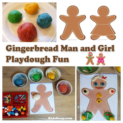 But if you don’t have the capacity to make real Gingerbread cookies, or you just don’t have the energy (me by the time I get to Friday class) you can also do play-dough gingerbread men, or cardboard and puffy paint. Kidssoup has a nice gingerbread playdough recipe and free play dough mate that you can download.