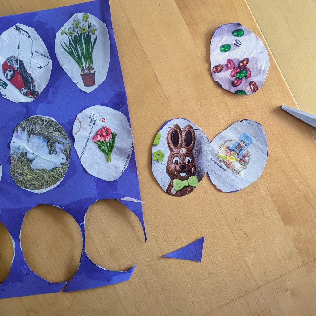 Next we made our eggs. Again, you can make your own by finding fun pictures in the newspaper adds, or printing off your own, or you can use the ones in my packet (last picture). In the last week I’ve done both. For my ESL kids class, I used the pre-made Easter egg picture flashcards, then today I made some homemade Easter egg flashcards with my two year old using the local newspaper advertisement and some pretty purple paper.