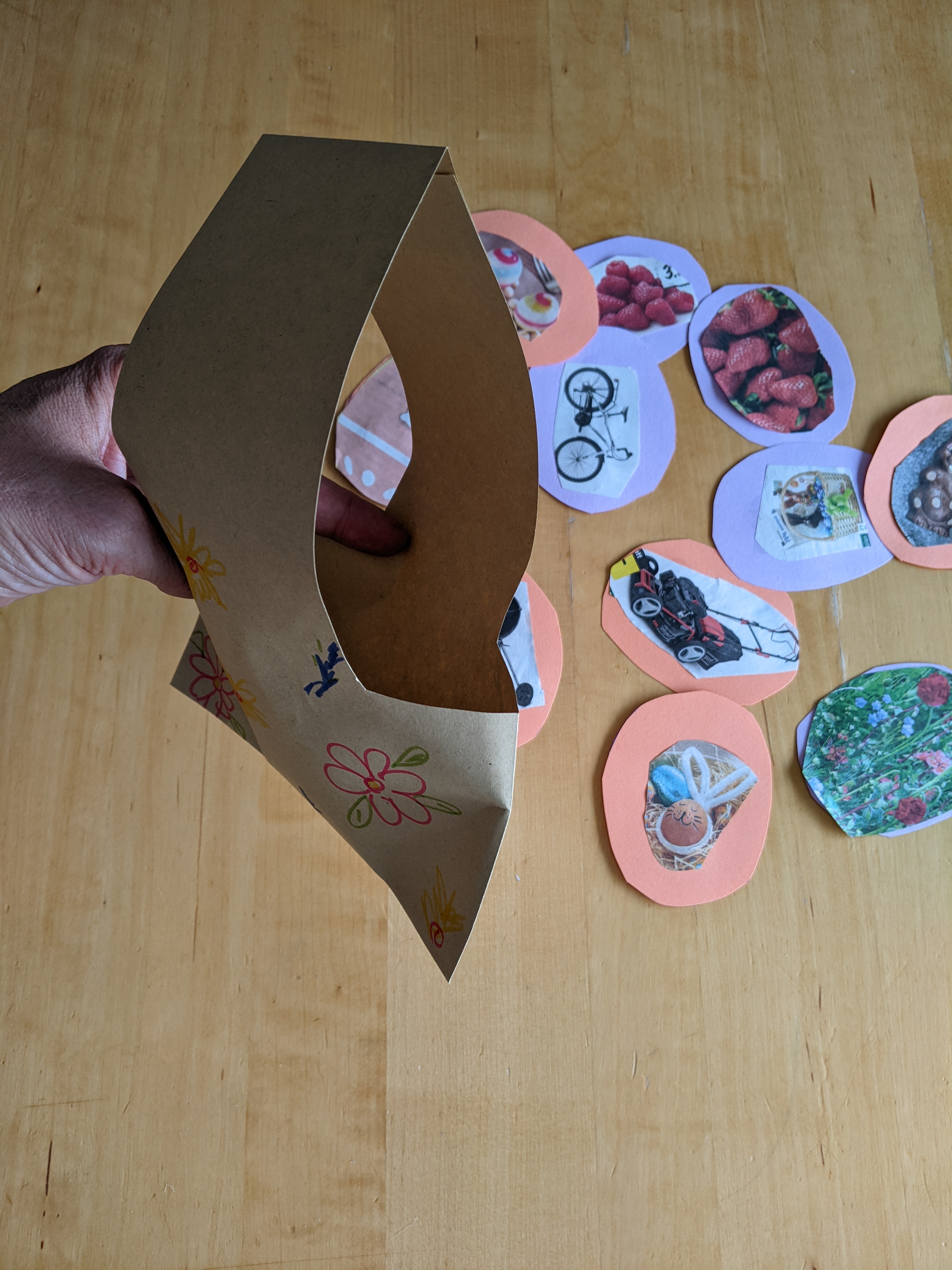 You can buy the packet including the basket and 27 spring vocally Easter egg flashcards here, it’s in color or black and white and only $2. But, I would encourage you to make your own if you have time, because the children love it, and they can choose the pictures that interest them. My son chose a chainsaw, bicycle and lost of different pictures of chocolate! LOL